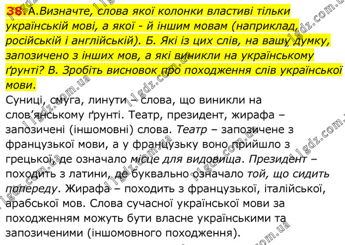 А.Визначте, слова якої колонки властиві тільки українській мові, а якої - й іншим мовам (наприклад, російській і англійській). Б. Які із цих слів, на вашу думку, запозичено з інших мов, а які виникли на українському ґрунті? В. Зробіть висновок про походження слів української мови. Суниці, смуга, линути – слова, що виникли на слов’янському ґрунті. Театр, президент, жирафа – запозичені (іншомовні) слова. Театр – запозичене з французької мови, а у французьку воно прийшло з грецької, де означало місце для видовища. Президент – походить з латини, де буквально означало той, що сидить попереду. Жирафа – походить з французької, італійської, арабської мов. Слова сучасної української мови за походженням можуть бути власне українськими та запозиченими (іншомовного походження).