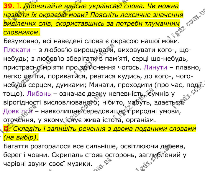 І. Прочитайте власне українські слова. Чи можна назвати їх окрасою мови? Поясніть лексичне значення виділених слів, скориставшись за потреби тлумачним словником. Безумовно, всі наведені слова є окрасою нашої мови. Плекати – з любов’ю вирощувати, виховувати кого-, що-небудь; з любов’ю зберігати в пам’яті, серці що-небудь, пристрасно мріяти про здійснення чогось. Линути – плавно, легко летіти, пориватися, рватися кудись, до кого-, чого-небудь серцем, думками; Минати, проходити (про час, події тощо). Либонь – означає деяку непевність, сумнів у вірогідності висловлюваного; нібито, мабуть, здається. Довкілля – навколишнє середовище; природні умови, оточення, у якому існує жива істота, організм. ІІ. Складіть і запишіть речення з двома поданими словами (на вибір). Багаття розгоралося все сильніше, освітлюючи дерева, берег і човни. Скрипаль стояв осторонь, заглиблений у чарівні звуки своєї музики.
