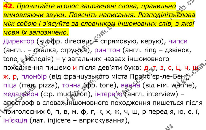 Прочитайте вголос запозичені слова, правильно вимовляючи звуки. Поясніть написання. Розподіліть слова між собою і з’ясуйте за словником іншомовних слів, з якої мови їх запозичено. Директор (від фр. direcieur – спрямовую, керую), чипси (англ.. – скалка, стружка), рингтон (англ. ring – дзвінок, tone – мелодія) – у загальних назвах іншомовного походження пишемо и після дев’яти букв: д, т, з, с, ц, ч, ш, ж, р, пломбір (від французького міста Промб’єр-ле-Бен), піца (італ. pizza), тонна (фр. tone), ванна (від нім. wanne), медальйон (фр. mudaillon), інтерв’ю (англ. interview) – апостроф в словах іншомовного походження пишеться після приголосних б, п, в, м, ф, г, к, х, ж, ч, ш, р перед я, ю, є, ї, ін’єкція (лат. injicere – вприскування),