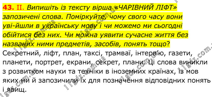 ІІ. Випишіть із тексту вірша «ЧАРІВНИЙ ЛІФТ» запозичені слова. Поміркуйте, чому свого часу вони увійшли в українську мову і чи можемо ми сьогодні обійтися без них. Чи можна уявити сучасне життя без названих ними предметів, засобів, понять тощо? Секретний, ліфт, план, таксі, трамваї, інтерв’ю, газети, планети, портрет, екрани, секрет, плани. Ці слова виникли з розвитком науки та техніки в іноземних країнах, із мов яких ми й запозичили їх для позначення відповідних понять і явищ.