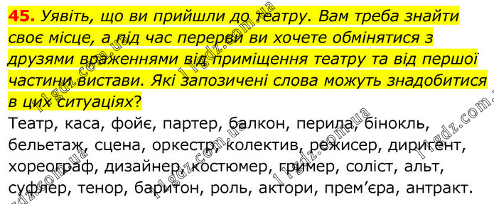 Уявіть, що ви прийшли до театру. Вам треба знайти своє місце, а під час перерви ви хочете обмінятися з друзями враженнями від приміщення театру та від першої частини вистави. Які запозичені слова можуть знадобитися в цих ситуаціях? Театр, каса, фойє, партер, балкон, перила, бінокль, бельетаж, сцена, оркестр, колектив, режисер, диригент, хореограф, дизайнер, костюмер, гример, соліст, альт, суфлер, тенор, баритон, роль, актори, прем’єра, антракт.