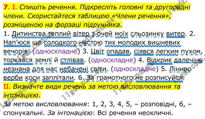 І. Спишіть речення. Підкресліть головні та другорядні члени. Скористайтеся таблицею «Члени речення», розміщеною на форзаці підручника. 1. Дитинства теплий вітер з очей моїх сльозинку витер. 2. Нап’юся ще солодкого настою тих молодих вишневих вечорів. (односкладне) 3. Цвіт опадав, сіявся легким пухом, торкався землі й стлівав. (односкладне) 4. Відкриє далечінь незнана для нас небачені світи. (односкладне) 5. Ліниво верби коси заплітали. 6. За грамотного не розписуйся. ІІ. Визначте види речень за метою висловлювання та інтонацією. За метою висловлювання: 1, 2, 3, 4, 5, – розповідні, 6, – спонукальні. За інтонацією: Всі речення неокличні.
