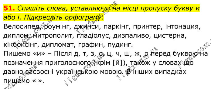 Спишіть слова, уставляючи на місці пропуску букву и або і. Підкресліть орфограму. Велосипед, роумінг, джинси, паркінг, принтер, інтонация, диплом, митрополит, гладіолус, дизпаливо, цистерна, кікбоксінг, дипломат, графин, пудинг. Пишемо «и» – Після д, т, з, с, ц, ч, ш, ж, р перед буквою на позначення приголосного (крім [й]), також у словах що давно засвоєні українською мовою. В інших випадках пишемо «і».