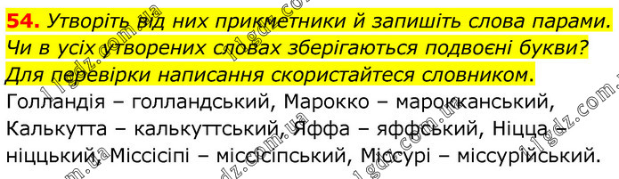 Утворіть від них прикметники й запишіть слова парами. Чи в усіх утворених словах зберігаються подвоєні букви? Для перевірки написання скористайтеся словником. Голландія – голландський, Марокко – марокканський, Калькутта – калькуттський, Яффа – яффський, Ніцца – ніццький, Міссісіпі – міссісіпський, Міссурі – міссурійський.