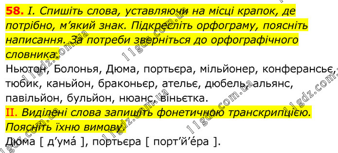 І. Спишіть слова, уставляючи на місці крапок, де потрібно, м’який знак. Підкресліть орфограму, поясніть написання. За потреби зверніться до орфографічного словника. Ньютон, Болонья, Дюма, портьєра, мільйонер, конферансьє, тюбик, каньйон, браконьєр, ательє, дюбель, альянс, павільйон, бульйон, нюанс, віньєтка. II. Виділені слова запишіть фонетичною транскрипцією. Поясніть їхню вимову. Дюма [ д’ума́ ], портьєра [ порт’й’е́ра ].