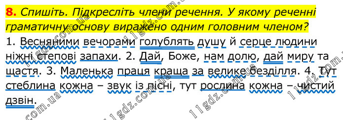 Спишіть. Підкресліть члени речення. У якому реченні граматичну основу виражено одним головним членом? 1. Весняними вечорами голублять душу й серце людини ніжні степові запахи. 2. Дай, Боже, нам долю, дай миру та щастя. 3. Маленька праця краща за велике безділля. 4. Тут стеблина кожна – звук із пісні, тут рослина кожна – чистий дзвін.