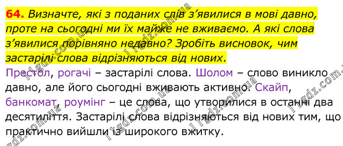 Визначте, які з поданих слів з’явилися в мові давно, проте на сьогодні ми їх майже не вживаємо. А які слова з’явилися порівняно недавно? Зробіть висновок, чим застарілі слова відрізняються від нових. Престол, рогачі – застарілі слова. Шолом – слово виникло давно, але його сьогодні вживають активно. Скайп, банкомат, роумінг – це слова, що утворилися в останні два десятиліття. Застарілі слова відрізняються від нових тим, що практично вийшли із широкого вжитку.