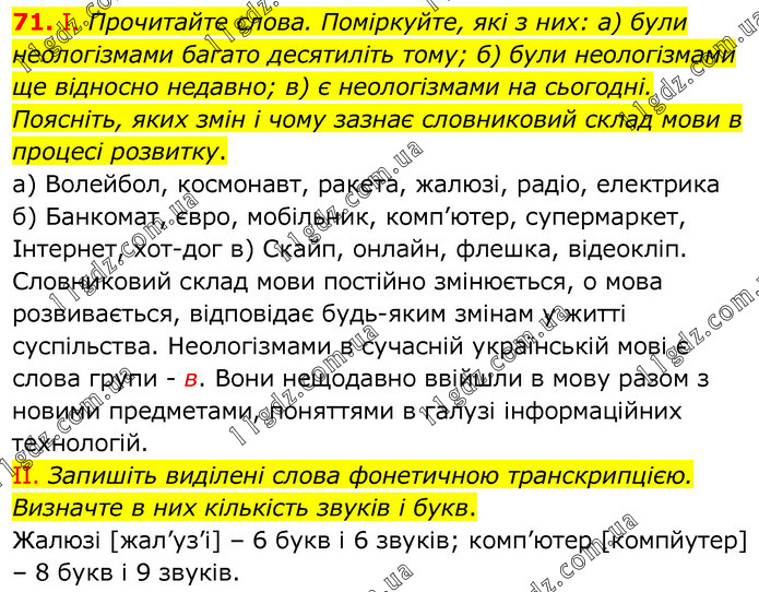 І. Прочитайте слова. Поміркуйте, які з них: а) були неологізмами багато десятиліть тому; б) були неологізмами ще відносно недавно; в) є неологізмами на сьогодні. Поясніть, яких змін і чому зазнає словниковий склад мови в процесі розвитку. а) Волейбол, космонавт, ракета, жалюзі, радіо, електрика б) Банкомат, євро, мобільник, комп’ютер, супермаркет, Інтернет, хот-дог в) Скайп, онлайн, флешка, відеокліп. Словниковий склад мови постійно змінюється, о мова розвивається, відповідає будь-яким змінам у житті суспільства. Неологізмами в сучасній українській мові є слова групи - в. Вони нещодавно ввійшли в мову разом з новими предметами, поняттями в галузі інформаційних технологій. ІІ. Запишіть виділені слова фонетичною транскрипцією. Визначте в них кількість звуків і букв. Жалюзі [жал’уз’і] – 6 букв і 6 звуків; комп’ютер [компйутер] – 8 букв і 9 звуків.