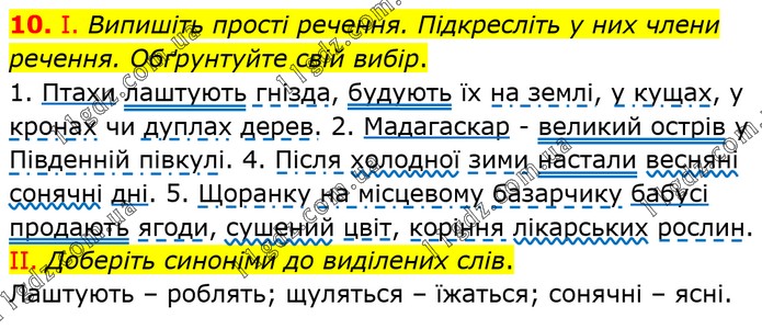 І. Випишіть прості речення. Підкресліть у них члени речення. Обґрунтуйте свій вибір. 1. Птахи лаштують гнізда, будують їх на землі, у кущах, у кронах чи дуплах дерев. 2. Мадагаскар - великий острів у Південній півкулі. 4. Після холодної зими настали весняні сонячні дні. 5. Щоранку на місцевому базарчику бабусі продають ягоди, сушений цвіт, коріння лікарських рослин. ІІ. Доберіть синоніми до виділених слів. Лаштують – роблять; щуляться – їжаться; сонячні – ясні.