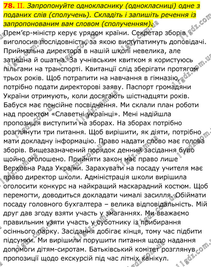 ІІ. Запропонуйте однокласнику (однокласниці) одне з поданих слів (сполучень). Складіть і запишіть речення із запропонованим вам словом (сполученням). Прем’єр-міністр керує урядом країни. Секретар зборів виголосив послідовність, за якою виступатимуть доповідачі. Приймальна директора в нашій школі невелика, але затишна й ошатна. За учнівським квитком я користуюсь пільгами на транспорті. Квитанції слід зберігати протягом трьох років. Щоб потрапити на навчання в гімназію, потрібно подати директорові заяву. Паспорт громадяни України отримують, коли досягають шістнадцяти років. Бабуся має пенсійне посвідчення. Ми склали план роботи над проектом «Славетні українці». Мені надійшла пропозиція виступити на зборах. На зборах потрібно розглянути три питання. Щоб вирішити, як діяти, потрібно мати докладну інформацію. Право надати слово має голова зборів. Вищезазначений порядок денний засідання було щойно оголошено. Прийняти закон має право лише Верховна Рада України. Зарахувати на посаду учителя має право директор школи. Адміністрація школи вирішила оголосити конкурс на найкращий маскарадний костюм. Щоб перемогти, доводиться докладати чималі засилля. Обіймати посаду головного бухгалтера – велика відповідальність. Мій друг дав згоду взяти участь у змаганнях. Ми вважаємо правильним узяти участь у суботнику із прибирання осіннього парку. Засідання добігає кінця, тому час підбити підсумки. Ми вирішили порушити питання щодо надання допомоги дітям-сиротам. Батьківський комітет розглянув пропозиції щодо екскурсій під час літніх канікул.