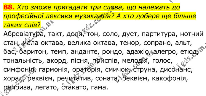 Хто зможе пригадати три слова, що належать до професійної лексики музикантів? А хто добере ще більше таких слів? Абревіатура, такт, доля, тон, соло, дует, партитура, нотний стан, мала октава, велика октава, тенор, сопрано, альт, бас, баритон, темп, анданте, рондо, адажіо, алегро, етюд, тональність, акорд, пісня, приспів, мелодія, голос, симфонія, гармонія, ораторія, смичок, струна, дисонанс, хорал, реквієм, речитатив, соната, реквієм, какофонія, реприза, легато, стакато, гама.