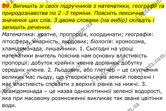 Випишіть зі своїх підручників з математики, географії та природознавства по 2 -3 терміни. Поясніть лексичне значення цих слів. З двома словами (на вибір) складіть і запишіть речення. Математика: кратне, пропорція, координати; географія: літосфера, хмарність, льодовик; біологія: хромосома, хламідомонада, лишайники. 1. Сьогодні на уроці математики вчитель пояснив нам основну властивість пропорції: добуток крайніх членів дорівнює добутку середніх членів. 2. Льодовик, або глетчер – це скупчення великих мас льоду, що утворюється на земній поверхні і має властивість сповзати з верхніх рівнів на нижчі. 3. Хламідомонада – це назва одноклітинної зеленої водорості, яка при масовому розмноженні викликає так зване цвітіння води.
