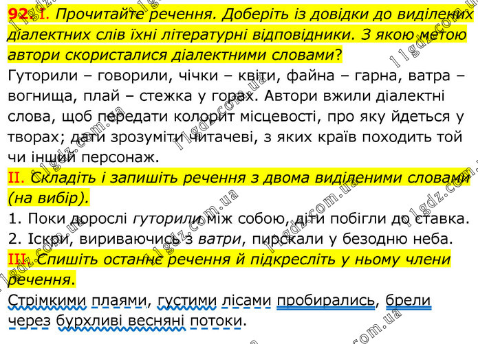 І. Прочитайте речення. Доберіть із довідки до виділених діалектних слів їхні літературні відповідники. З якою метою автори скористалися діалектними словами? Гуторили – говорили, чічки – квіти, файна – гарна, ватра – вогнища, плай – стежка у горах. Автори вжили діалектні слова, щоб передати колорит місцевості, про яку йдеться у творах; дати зрозуміти читачеві, з яких країв походить той чи інший персонаж. ІІ. Складіть і запишіть речення з двома виділеними словами (на вибір). 1. Поки дорослі гуторили між собою, діти побігли до ставка. 2. Іскри, вириваючись з ватри, пирскали у безодню неба. ІІІ. Спишіть останнє речення й підкресліть у ньому члени речення. Стрімкими плаями, густими лісами пробирались, брели через бурхливі весняні потоки.