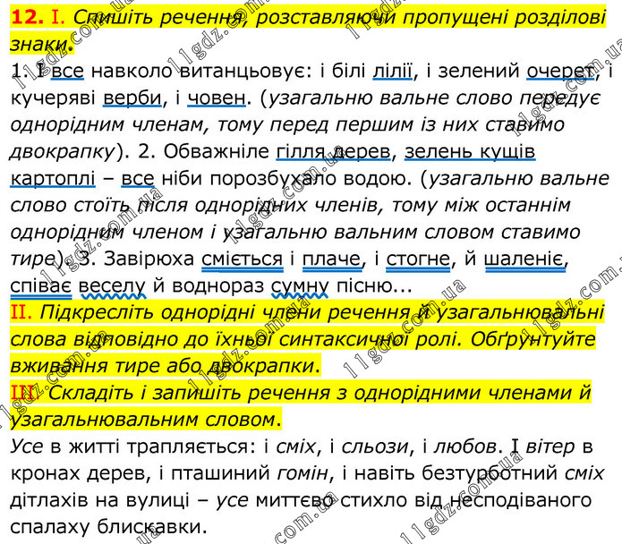 І. Спишіть речення, розставляючи пропущені розділові знаки. 1. І все навколо витанцьовує: і білі лілії, і зелений очерет, і кучеряві верби, і човен. (узагальню вальне слово передує однорідним членам, тому перед першим із них ставимо двокрапку). 2. Обважніле гілля дерев, зелень кущів картоплі – все ніби порозбухало водою. (узагальню вальне слово стоїть після однорідних членів, тому між останнім однорідним членом і узагальню вальним словом ставимо тире). 3. Завірюха сміється і плаче, і стогне, й шаленіє, співає веселу й воднораз сумну пісню... ІІ. Підкресліть однорідні члени речення й узагальнювальні слова відповідно до їхньої синтаксичної ролі. Обґрунтуйте вживання тире або двокрапки. ІІІ. Складіть і запишіть речення з однорідними членами й узагальнювальним словом. Усе в житті трапляється: і сміх, і сльози, і любов. І вітер в кронах дерев, і пташиний гомін, і навіть безтурботний сміх дітлахів на вулиці – усе миттєво стихло від несподіваного спалаху блискавки.