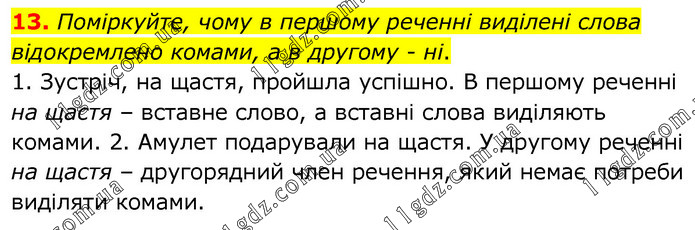 Поміркуйте, чому в першому реченні виділені слова відокремлено комами, а в другому - ні. 1. Зустріч, на щастя, пройшла успішно. В першому реченні на щастя – вставне слово, а вставні слова виділяють комами. 2. Амулет подарували на щастя. У другому реченні на щастя – другорядний член речення, який немає потреби виділяти комами.