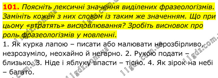 Поясніть лексичні значення виділених фразеологізмів. Замініть кожен з них словом із таким же значенням. Що при цьому «втратять» висловлювання? Зробіть висновок про роль фразеологізмів у мовленні. 1. Як курка лапою – писати або малювати нерозбірливо, незрозуміло, неохайно й негарно. 2. Рукою подати – близько. 3. Ніде і яблуку впасти – тісно. 4. Як зірок на небі – багато.