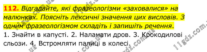 Відгадайте, які фразеологізми «заховалися» на малюнках. Поясніть лексичні значення цих висловів. З одним фразеологізмом складіть і запишіть речення. 1. Знайти в капусті. 2. Наламати дров. 3. Крокодилові сльози. 4. Встромляти палиці в колесі.