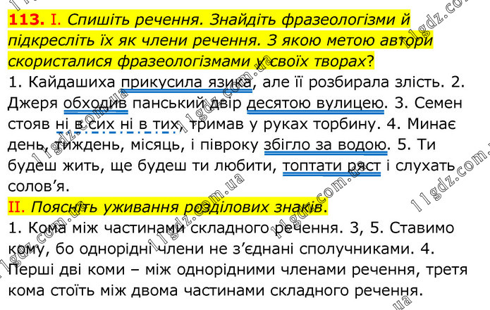 І. Спишіть речення. Знайдіть фразеологізми й підкресліть їх як члени речення. З якою метою автори скористалися фразеологізмами у своїх творах? 1. Кайдашиха прикусила язика, але її розбирала злість. 2. Джеря обходив панський двір десятою вулицею. 3. Семен стояв ні в сих ні в тих, тримав у руках торбину. 4. Минає день, тиждень, місяць, і півроку збігло за водою. 5. Ти будеш жить, ще будеш ти любити, топтати ряст і слухать солов’я. ІІ. Поясніть уживання розділових знаків. 1. Кома між частинами складного речення. 3, 5. Ставимо кому, бо однорідні члени не з’єднані сполучниками. 4. Перші дві коми – між однорідними членами речення, третя кома стоїть між двома частинами складного речення.