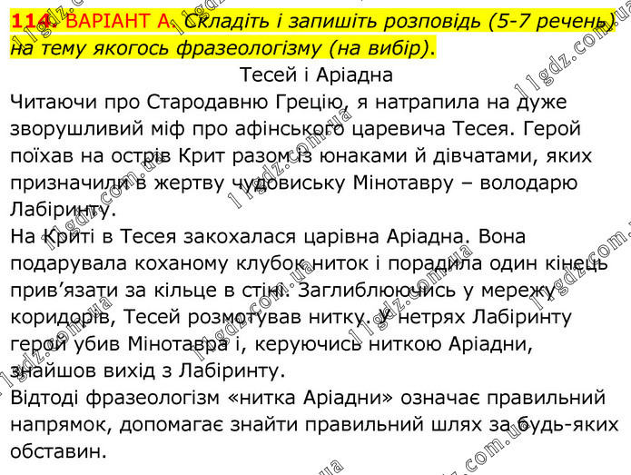 ВАРІАНТ А. Складіть і запишіть розповідь (5-7 речень) на тему якогось фразеологізму (на вибір). Тесей і Аріадна Читаючи про Стародавню Грецію, я натрапила на дуже зворушливий міф про афінського царевича Тесея. Герой поїхав на острів Крит разом із юнаками й дівчатами, яких призначили в жертву чудовиську Мінотавру – володарю Лабіринту. На Криті в Тесея закохалася царівна Аріадна. Вона подарувала коханому клубок ниток і порадила один кінець прив’язати за кільце в стіні. Заглиблюючись у мережу коридорів, Тесей розмотував нитку. У нетрях Лабіринту герой убив Мінотавра і, керуючись ниткою Аріадни, знайшов вихід з Лабіринту. Відтоді фразеологізм «нитка Аріадни» означає правильний напрямок, допомагає знайти правильний шлях за будь-яких обставин.