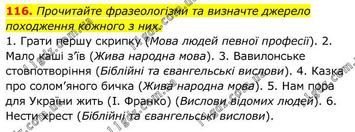 Прочитайте фразеологізми та визначте джерело походження кожного з них. 1. Грати першу скрипку (Мова людей певної професії). 2. Мало каші з’їв (Жива народна мова). 3. Вавилонське стовпотворіння (Біблійні та євангельські вислови). 4. Казка про солом’яного бичка (Жива народна мова). 5. Нам пора для України жить (І. Франко) (Вислови відомих людей). 6. Нести хрест (Біблійні та євангельські вислови).