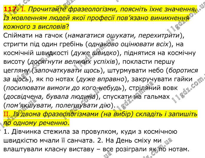 І. Прочитайте фразеологізми, поясніть їхнє значення. Із мовленням людей якої професії пов’язано виникнення кожного з висловів? Спіймати на гачок (намагатися ошукати, перехитрити), стригти під один гребінь (однаково оцінювати всіх), на космічній швидкості (дуже швидко), піднятися на космічну висоту (досягнути великих успіхів), покласти першу цегляну (започаткувати щось), штурмувати небо (боротися за щось), як по нотах (дуже вправно), закручувати гайки (посилювати вимоги до кого-небудь), стріляний вовк (досвідчена, бувала людина), спускати на гальмах (пом’якшувати, полегшувати дію). ІІ. Із двома фразеологізмами (на вибір) складіть і запишіть по одному реченню. 1. Дівчинка стежила за провулком, куди з космічною швидкістю мчали її санчата. 2. На День сміху ми влаштували класну виставу – все розіграли як по нотам.