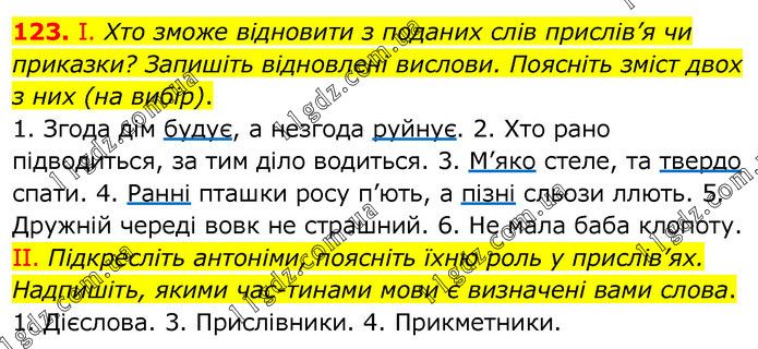 І. Хто зможе відновити з поданих слів прислів’я чи приказки? Запишіть відновлені вислови. Поясніть зміст двох з них (на вибір). 1. Згода дім будує, а незгода руйнує. 2. Хто рано підводиться, за тим діло водиться. 3. М’яко стеле, та твердо спати. 4. Ранні пташки росу п’ють, а пізні сльози ллють. 5. Дружній череді вовк не страшний. 6. Не мала баба клопоту. ІІ. Підкресліть антоніми, поясніть їхню роль у прислів’ях. Надпишіть, якими частинами мови є визначені вами слова. 1. Дієслова. 3. Прислівники. 4. Прикметники.