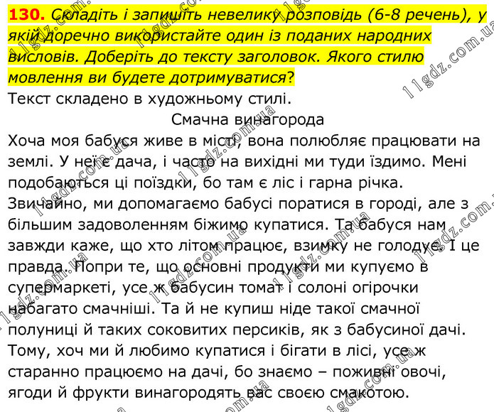 Складіть і запишіть невелику розповідь (6-8 речень), у якій доречно використайте один із поданих народних висловів. Доберіть до тексту заголовок. Якого стилю мовлення ви будете дотримуватися? Текст складено в художньому стилі. Смачна винагорода Хоча моя бабуся живе в місті, вона полюбляє працювати на землі. У неї є дача, і часто на вихідні ми туди їздимо. Мені подобаються ці поїздки, бо там є ліс і гарна річка. Звичайно, ми допомагаємо бабусі поратися в городі, але з більшим задоволенням біжимо купатися. Та бабуся нам завжди каже, що хто літом працює, взимку не голодує. І це правда. Попри те, що основні продукти ми купуємо в супермаркеті, усе ж бабусин томат і солоні огірочки набагато смачніші. Та й не купиш ніде такої смачної полуниці й таких соковитих персиків, як з бабусиної дачі. Тому, хоч ми й любимо купатися і бігати в лісі, усе ж старанно працюємо на дачі, бо знаємо – поживні овочі, ягоди й фрукти винагородять вас своєю смакотою.
