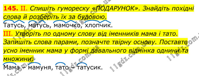 II. Спишіть гумореску «ПОДАРУНОК». Знайдіть похідні слова й розберіть їх за будовою. Татусь, матусь, мамочко, хлопчик. ІІІ. Утворіть по одному слову від іменників мама і тато. Запишіть слова парами, позначте твірну основу. Поставте усно іменник мама у формі давального відмінка однини та множини. Мама – мамуня, тато – татусик.