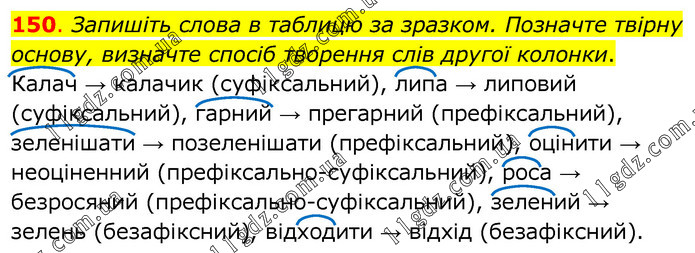 Запишіть слова в таблицю за зразком. Позначте твірну основу, визначте спосіб творення слів другої колонки. Калач → калачик (суфіксальний), липа → липовий (суфіксальний), гарний → прегарний (префіксальний), зеленішати → позеленішати (префіксальний), оцінити → неоціненний (префіксально-суфіксальний), роса → безросяний (префіксально-суфіксальний), зелений → зелень (безафіксний), відходити → відхід (безафіксний).