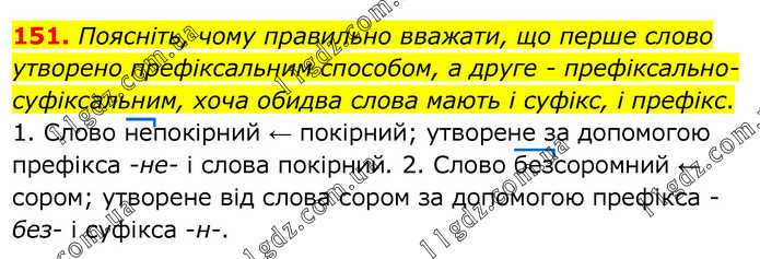 Поясніть, чому правильно вважати, що перше слово утворено префіксальним способом, а друге - префіксально-суфіксальним, хоча обидва слова мають і суфікс, і префікс. 1. Слово непокірний ← покірний; утворене за допомогою префікса -не- і слова покірний. 2. Слово безсоромний ← сором; утворене від слова сором за допомогою префікса -без- і суфікса -н-.