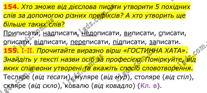 154. Хто зможе від дієслова писати утворити 5 похідних слів за допомогою різних префіксів? А хто утворить ще більше таких слів? Приписати, надписати, недописати, виписати, списати, описати, відписати, переписати, підписати, записати. 155. І-ІІ. Прочитайте виразно вірш «ГОСТИННА ХАТА». Знайдіть у тексті назви осіб за професією. Поміркуйте, від яких спів вони утворені та вкажіть спосіб словотворення. Тесляре (від тесати), муляре (від мур), столяре (від стіл), скляре (від скло), ковалю (від ковадло) (Кл. в).