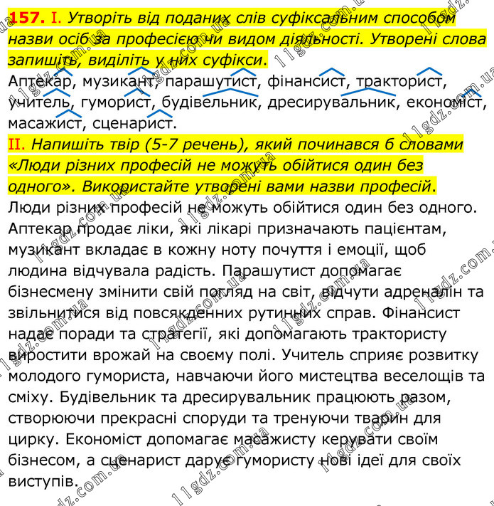І. Утворіть від поданих слів суфіксальним способом назви осіб за професією чи видом діяльності. Утворені слова запишіть, виділіть у них суфікси. Аптекар, музикант, парашутист, фінансист, тракторист, учитель, гуморист, будівельник, дресирувальник, економіст, масажист, сценарист. ІІ. Напишіть твір (5-7 речень), який починався б словами «Люди різних професій не можуть обійтися один без одного». Використайте утворені вами назви професій. Люди різних професій не можуть обійтися один без одного. Аптекар продає ліки, які лікарі призначають пацієнтам, музикант вкладає в кожну ноту почуття і емоції, щоб людина відчувала радість. Парашутист допомагає бізнесмену змінити свій погляд на світ, відчути адреналін та звільнитися від повсякденних рутинних справ. Фінансист надає поради та стратегії, які допомагають трактористу виростити врожай на своєму полі. Учитель сприяє розвитку молодого гумориста, навчаючи його мистецтва веселощів та сміху. Будівельник та дресирувальник працюють разом, створюючи прекрасні споруди та тренуючи тварин для цирку. Економіст допомагає масажисту керувати своїм бізнесом, а сценарист дарує гумористу нові ідеї для своїх виступів.
