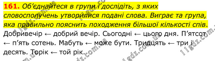 Об’єднайтеся в групи і дослідіть, з яких словосполучень утворилися подані слова. Виграє та група, яка правильно пояснить походження більшої кількості спів. Добривечір ← добрий вечір. Сьогодні ← цього дня. П’ятсот ← п’ять сотень. Мабуть ← може бути. Тридцять ← три і десять. Торік ← той рік.