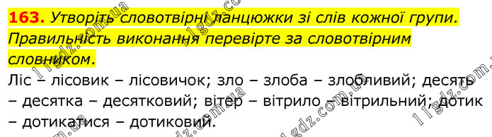 Утворіть словотвірні ланцюжки зі слів кожної групи. Правильність виконання перевірте за словотвірним словником. Ліс – лісовик – лісовичок; зло – злоба – злобливий; десять – десятка – десятковий; вітер – вітрило – вітрильний; дотик – дотикатися – дотиковий.
