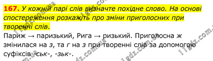 У кожній парі слів визначте похідне слово. На основі спостереження розкажіть про зміни приголосних при творенні слів. Париж → паризький, Рига → ризький. Приголосна ж змінилася на з, та г на з при творенні слів за допомогою суфіксів -ськ-, -зьк-.