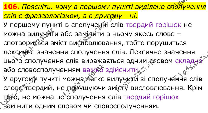 Поясніть, чому в першому пункті виділене сполучення слів є фразеологізмом, а в другому - ні. У першому пункті в сполученні слів твердий горішок не можна вилучити або замінити в ньому якесь слово – спотвориться зміст висловлювання, тобто порушиться лексичне значення сполучення слів. Лексичне значення цього сполучення слів виражається одним словом складно або словосполученням важко здійснити. У другому пункті можна легко вилучити зі сполучення слів слово твердий, не порушуючи змісту висловлювання. Крім того, не можна це сполучення слів твердий горішок замінити одним словом чи словосполученням.