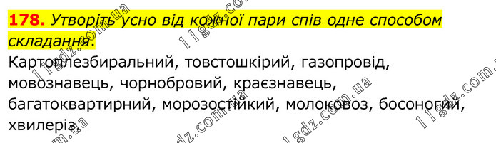 Утворіть усно від кожної пари спів одне способом складання. Картоплезбиральний, товстошкірий, газопровід, мовознавець, чорнобровий, краєзнавець, багатоквартирний, морозостійкий, молоковоз, босоногий, хвилеріз.