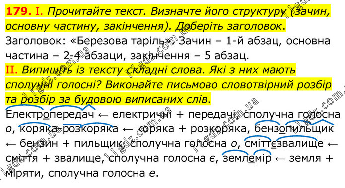 І. Прочитайте текст. Визначте його структуру (зачин, основну частину, закінчення). Доберіть заголовок. Заголовок: «Березова таріль». Зачин – 1-й абзац, основна частина – 2-4 абзаци, закінчення – 5 абзац. ІІ. Випишіть із тексту складні слова. Які з них мають сполучні голосні? Виконайте письмово словотвірний розбір та розбір за будовою виписаних слів. Електропередач ← електричні + передачі, сполучна голосна о, коряка-розкоряка ← коряка + розкоряка, бензопильщик ← бензин + пильщик, сполучна голосна о, сміттєзвалище ← сміття + звалище, сполучна голосна є, землемір ← земля + міряти, сполучна голосна е.