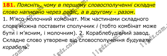 Поясніть, чому в першому словосполученні складне слово написано через дефіс, а в другому - разом. 1. М’ясо-молочний комбінат. Між частинами складного слова можна поставити сполучник і (тобто комбінат може бути і м’ясним, і молочним). 2. Кораблебудівний завод. Складне слово утворене від словосполучення будувати корабель.