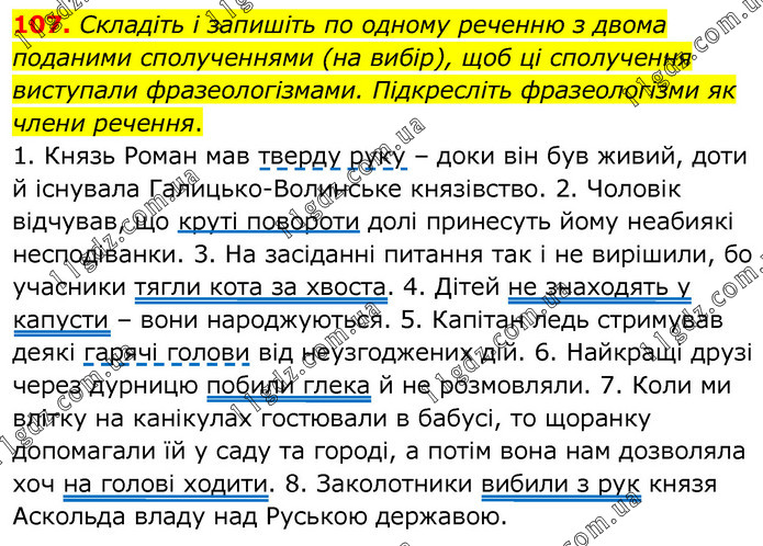Складіть і запишіть по одному реченню з двома поданими сполученнями (на вибір), щоб ці сполучення виступали фразеологізмами. Підкресліть фразеологізми як члени речення. 1. Князь Роман мав тверду руку – доки він був живий, доти й існувала Галицько-Волинське князівство. 2. Чоловік відчував, що круті повороти долі принесуть йому неабиякі несподіванки. 3. На засіданні питання так і не вирішили, бо учасники тягли кота за хвоста. 4. Дітей не знаходять у капусти – вони народжуються. 5. Капітан ледь стримував деякі гарячі голови від неузгоджених дій. 6. Найкращі друзі через дурницю побили глека й не розмовляли. 7. Коли ми влітку на канікулах гостювали в бабусі, то щоранку допомагали їй у саду та городі, а потім вона нам дозволяла хоч на голові ходити. 8. Заколотники вибили з рук князя Аскольда владу над Руською державою.