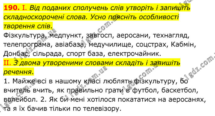 І. Від поданих сполучень слів утворіть і запишіть складноскорочені слова. Усно поясніть особливості творення слів. Фізкультура, медпункт, завгосп, аеросани, технагляд, телепрограма, авіабаза, медучилище, соцстрах, Кабмін, Донбас, сільрада, спорт база, електрочайник. ІІ. З двома утвореними словами складіть і запишіть речення. 1. Майже всі в нашому класі люблять фізкультуру, бо вчитель вчить, як правильно грати в футбол, баскетбол, волейбол. 2. Як би мені хотілося покататися на аеросанях, та я їх бачив тільки по телевізору.