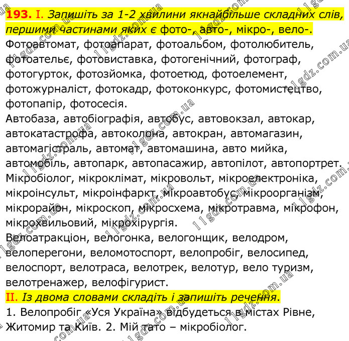 І. Запишіть за 1-2 хвилини якнайбільше складних слів, першими частинами яких є фото-, авто-, мікро-, вело-. Фотоавтомат, фотоапарат, фотоальбом, фотолюбитель, фотоательє, фотовиставка, фотогенічний, фотограф, фотогурток, фотозйомка, фотоетюд, фотоелемент, фотожурналіст, фотокадр, фотоконкурс, фотомистецтво, фотопапір, фотосесія. Автобаза, автобіографія, автобус, автовокзал, автокар, автокатастрофа, автоколона, автокран, автомагазин, автомагістраль, автомат, автомашина, авто мийка, автомобіль, автопарк, автопасажир, автопілот, автопортрет. Мікробіолог, мікроклімат, мікровольт, мікроелектроніка, мікроінсульт, мікроінфаркт, мікроавтобус, мікроорганізм, мікрорайон, мікроскоп, мікросхема, мікротравма, мікрофон, мікрохвильовий, мікрохірургія. Велоатракціон, велогонка, велогонщик, велодром, велоперегони, веломотоспорт, велопробіг, велосипед, велоспорт, велотраса, велотрек, велотур, вело туризм, велотренажер, велофігурист. ІІ. Із двома словами складіть і запишіть речення. 1. Велопробіг «Уся Україна» відбудеться в містах Рівне, Житомир та Київ. 2. Мій тато – мікробіолог.