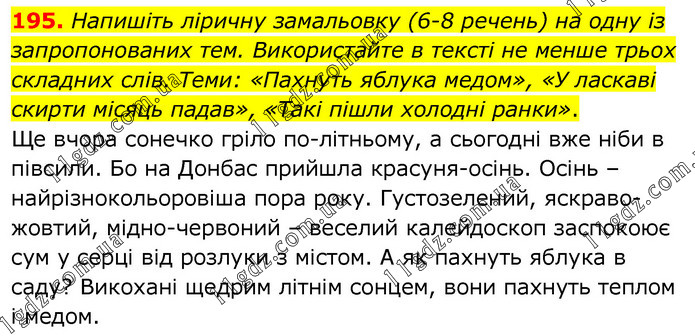 Напишіть ліричну замальовку (6-8 речень) на одну із запропонованих тем. Використайте в тексті не менше трьох складних слів. Теми: «Пахнуть яблука медом», «У ласкаві скирти місяць падав», «Такі пішли холодні ранки». Ще вчора сонечко гріло по-літньому, а сьогодні вже ніби в півсили. Бо на Донбас прийшла красуня-осінь. Осінь – найрізнокольоровіша пора року. Густозелений, яскраво-жовтий, мідно-червоний – веселий калейдоскоп заспокоює сум у серці від розлуки з містом. А як пахнуть яблука в саду? Викохані щедрим літнім сонцем, вони пахнуть теплом і медом.