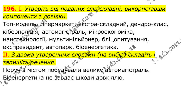 І. Утворіть від поданих слів складні, використавши компоненти з довідки. Топ-модель, гіпермаркет, екстра-складний, дендро-клас, кіберполіція, автомагістраль, мікроекономіка, нанотехнології, мультимільйонер, бліцопитування, експрезидент, автопарк, біоенергетика. ІІ. З двома утвореними словами (на вибір) складіть і запишіть речення. Поруч з містом побудували велику автомагістраль. Біоенергетика не завдає шкоди довкіллю.