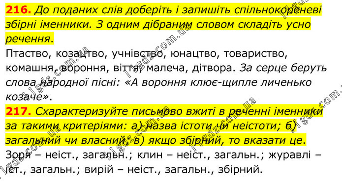 216. До поданих слів доберіть і запишіть спільнокореневі збірні іменники. З одним дібраним словом складіть усно речення. Птаство, козацтво, учнівство, юнацтво, товариство, комашня, вороння, віття, малеча, дітвора. За серце беруть слова народної пісні: «А вороння клює-щипле личенько козаче». 217. Схарактеризуйте письмово вжиті в реченні іменники за такими критеріями: а) назва істоти чи неістоти; б) загальний чи власний; в) якщо збірний, то вказати це. Зоря – неіст., загальн.; клин – неіст., загальн.; журавлі – іст., загальн.; вирій – неіст., загальн., збірний.