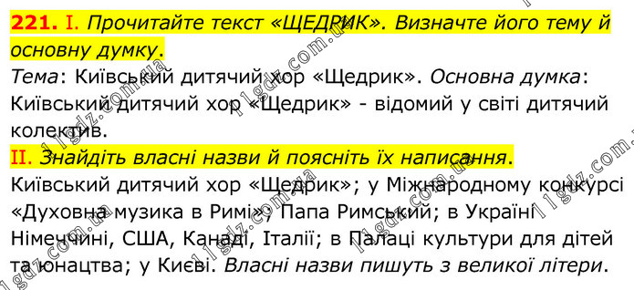 І. Прочитайте текст «ЩЕДРИК». Визначте його тему й основну думку. Тема: Київський дитячий хор «Щедрик». Основна думка: Київський дитячий хор «Щедрик» - відомий у світі дитячий колектив. ІІ. Знайдіть власні назви й поясніть їх написання. Київський дитячий хор «Щедрик»; у Міжнародному конкурсі «Духовна музика в Римі»; Папа Римський; в Україні Німеччині, США, Канаді, Італії; в Палаці культури для дітей та юнацтва; у Києві. Власні назви пишуть з великої літери.