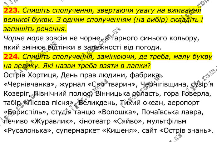 223. Спишіть сполучення, звертаючи увагу на вживання великої букви. З одним сполученням (на вибір) складіть і запишіть речення. Чорне море зовсім не чорне, а гарного синього кольору, який змінює відтінки в залежності від погоди. 224. Спишіть сполучення, замінюючи, де треба, малу букву на велику. Які назви треба взяти в лапки? Острів Хортиця, День прав людини, фабрика «Чернівчанка», журнал «Світ тварин», Чернігівщина, сузір’я Козеріг, Північний полюс, Вінницька область, гора Говерла, табір «Лісова пісня», Великдень, Тихий океан, аеропорт «Бориспіль», студія танцю «Волошка», Почаївська лавра, печиво «Журавлик», кінотеатр «Сяйво», мультфільм «Русалонька», супермаркет «Кишеня», сайт «Острів знань».