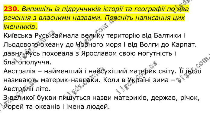 Випишіть із підручників історії та географії по два речення з власними назвами. Поясніть написання цих іменників. Київська Русь займала велику територію від Балтики і Льодового океану до Чорного моря і від Волги до Карпат. давня Русь поховала з Ярославом свою могутність і благополуччя. Австралія – найменший і найсухіший материк світу. Її іноді називають материк-навпаки. Коли в Україні зима – в Австралії літо. З великої букви пишуться назви материків, держав, річок, морей та океанів і імена людей.