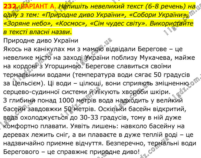 ВАРІАНТ А. Напишіть невеликий текст (6-8 речень) на одну з тем: «Природне диво України», «Собори України», «Зоряне небо», «Космос», «Сім чудес світу». Використайте в тексті власні назви. Природне диво України Якось на канікулах ми з мамою відвідали Берегове – це невелике місто на заході України поблизу Мукачева, майже на кордоні з Угорщиною. Берегове славиться своїми термальними водами (температура води сягає 50 градусів за Цельсієм). Ці води – цілющі, вони сприяють зміцненню серцево-судинної системи й лікують хвороби шкіри. З глибини понад 1000 метрів вода надходить у великий басейн завдовжки 50 метрів. Оскільки басейн відкритий, вода охолоджується до 30-33 градусів, тому в ній дуже комфортно плавати. Уявіть лишень: навколо басейну на деревах лежить сніг, а ви плаваєте в дуже теплій воді – це надзвичайно приємне відчуття. Безперечно, термальні води Берегового – це справжнє природне диво!
