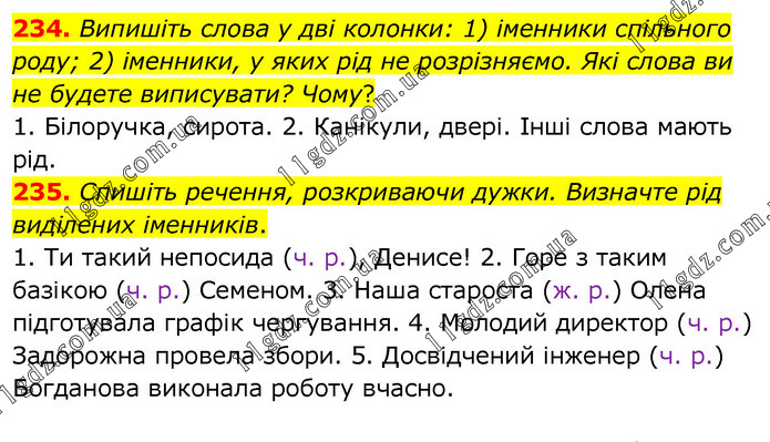 234. Випишіть слова у дві колонки: 1) іменники спільного роду; 2) іменники, у яких рід не розрізняємо. Які слова ви не будете виписувати? Чому? 1. Білоручка, сирота. 2. Канікули, двері. Інші слова мають рід. 235. Спишіть речення, розкриваючи дужки. Визначте рід виділених іменників. 1. Ти такий непосида (ч. р.), Денисе! 2. Горе з таким базікою (ч. р.) Семеном. 3. Наша староста (ж. р.) Олена підготувала графік чергування. 4. Молодий директор (ч. р.) Задорожна провела збори. 5. Досвідчений інженер (ч. р.) Богданова виконала роботу вчасно.